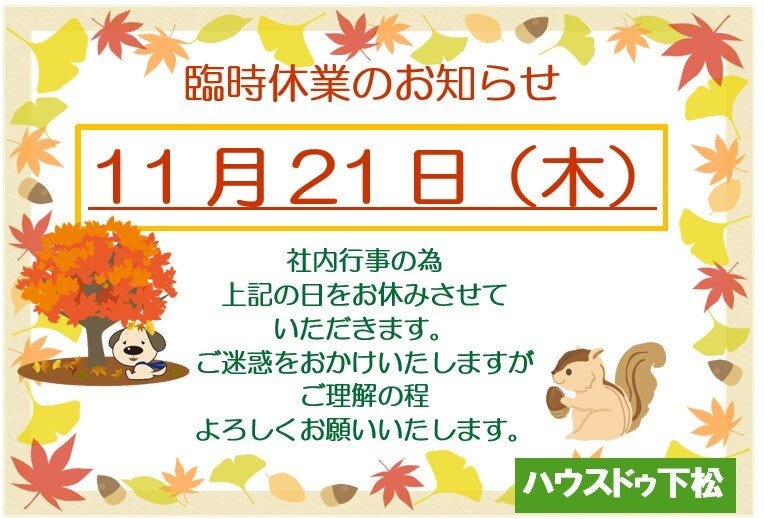 誠に勝手ではございますが、11月21日(木)は社内行事のため、臨時休業とさせていただきます。