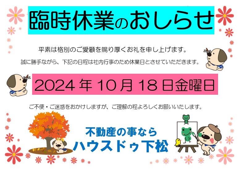 こんにちは!ハウスドゥ下松店です。 ◆◇◆臨時休業のお知らせ◆◇◆ 大変申し訳ございませんが 社内行事の為 下記の日程をお休みさせていただきます 2024年10月18日(金) ...
