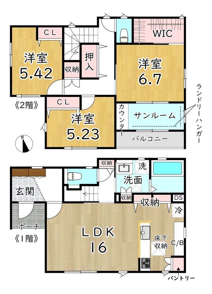 1階は16帖の広々としたLDKを中心に、洗面所・浴室などの水回りを集約。キッチン横には大容量のカップボードを備え、スムーズな調理をサポートします。玄関からホールを通ってすぐに手洗いができる配置も、現代のライフスタイルに最適です。2階には共働き世帯に嬉しいサンルームを完備。天候を気にせず洗濯物が干せ、そのままバルコニーへも出られます。また、主寝室には広々としたウォークインクローゼットを設け、住空間を常にスッキリと保てます。