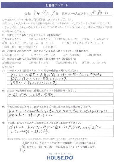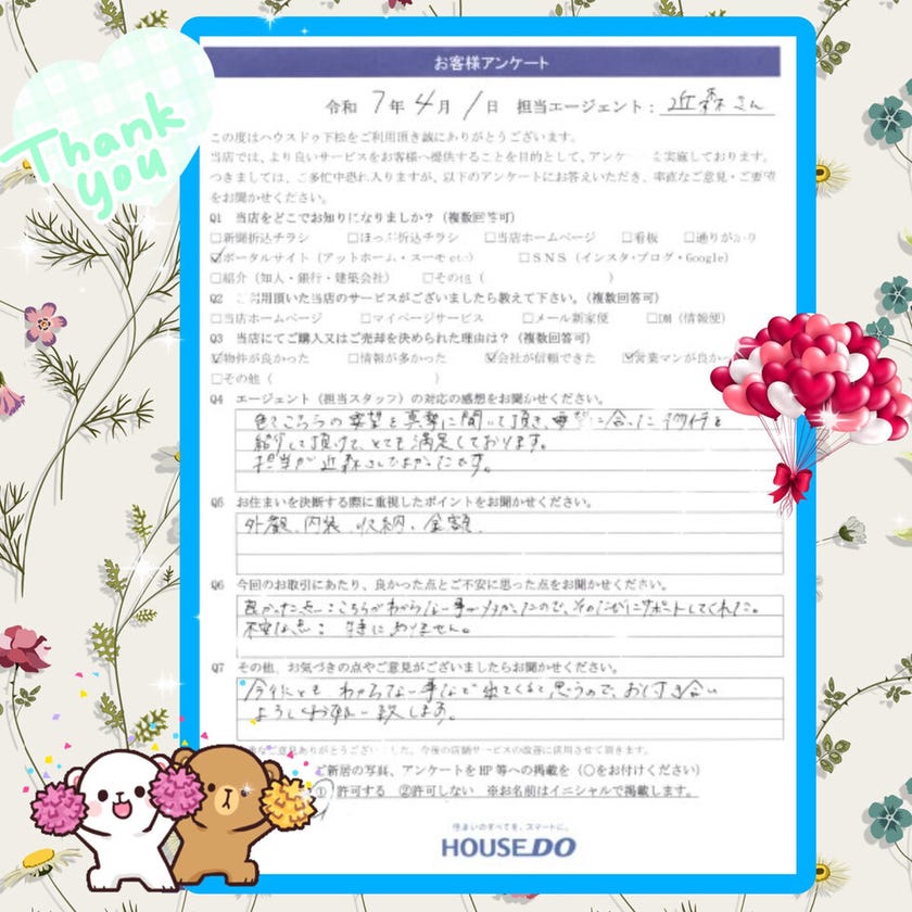 この度は「ハウスドゥ下松」で物件のご購入をいただきまして大変ありがとうございました。 O様のご希望に添えた物件をご紹介でき、私も嬉しく思っております。 O様の物件探しに対する情熱が、ピッタリの物件を呼び寄せたのでしょうね。ご家族皆様で、末永く笑顔でお過ごしになることを願っております。 また、お住まいでお困りごとやご相談事などありましたら、いつでもお待ちしております。この度は大変ありがとうございました。